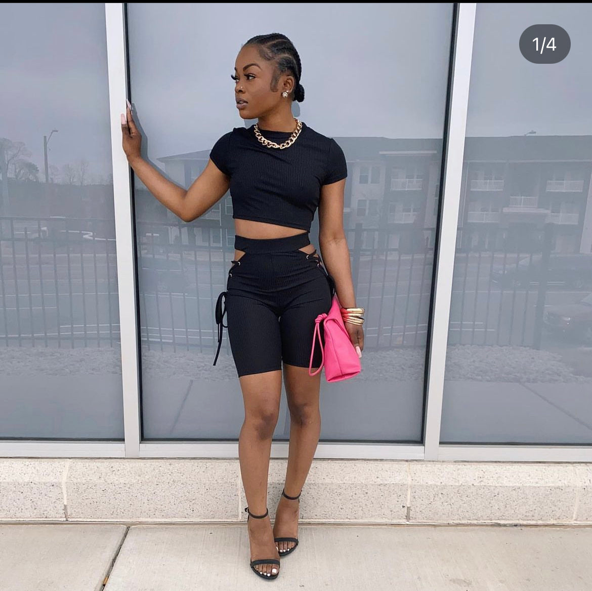 2 piece knit set with crop top and biker shorts with drawstrings on sides